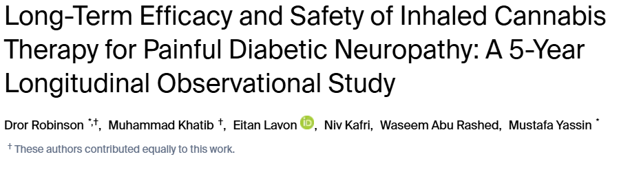 Robinson, D., Khatib, M., Lavon, E., Kafri, N., Abu Rashed, W., & Yassin, M. (2025). Long-term efficacy and safety of inhaled cannabis therapy for painful diabetic neuropathy: A 5-year longitudinal observational study. Preprints. https://doi.org/10.20944/preprints202508.1212.v1